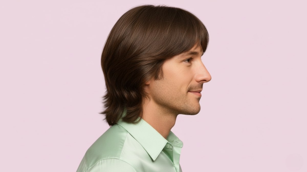 Hier is een kapsel dat vintage charme prachtig mengt met hedendaagse flair. Deze lange snit voor mannen is geïnspireerd op de iconische looks van de jaren 1970 en is gecreëerd met moderne stylingtechnieken, waardoor een uitstraling ontstaat die zowel nostalgisch als verfrissend actueel aanvoelt.