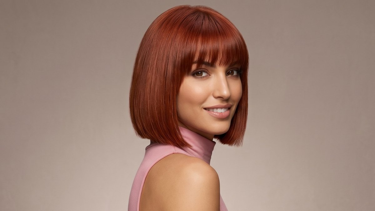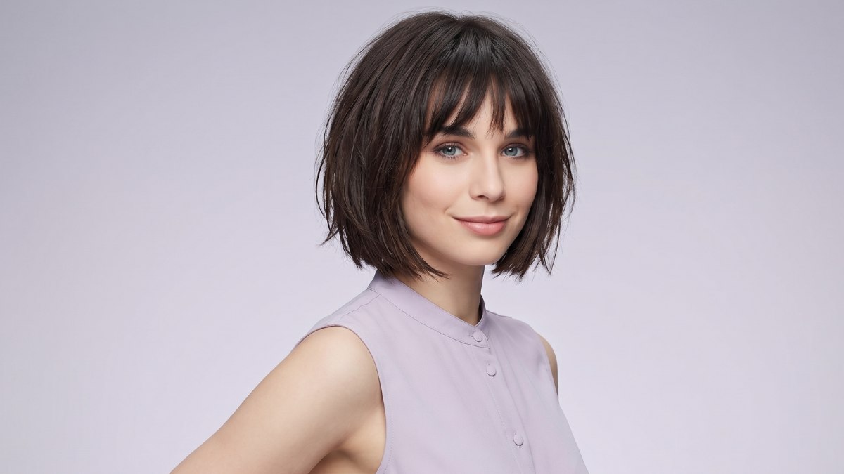 De pony is perfect in balans met de lengte van de bob. Samen vormen ze een krachtig geometrisch kader: de pony definieert het voorhoofd, de bob trekt de aandacht naar de jukbeenderen.