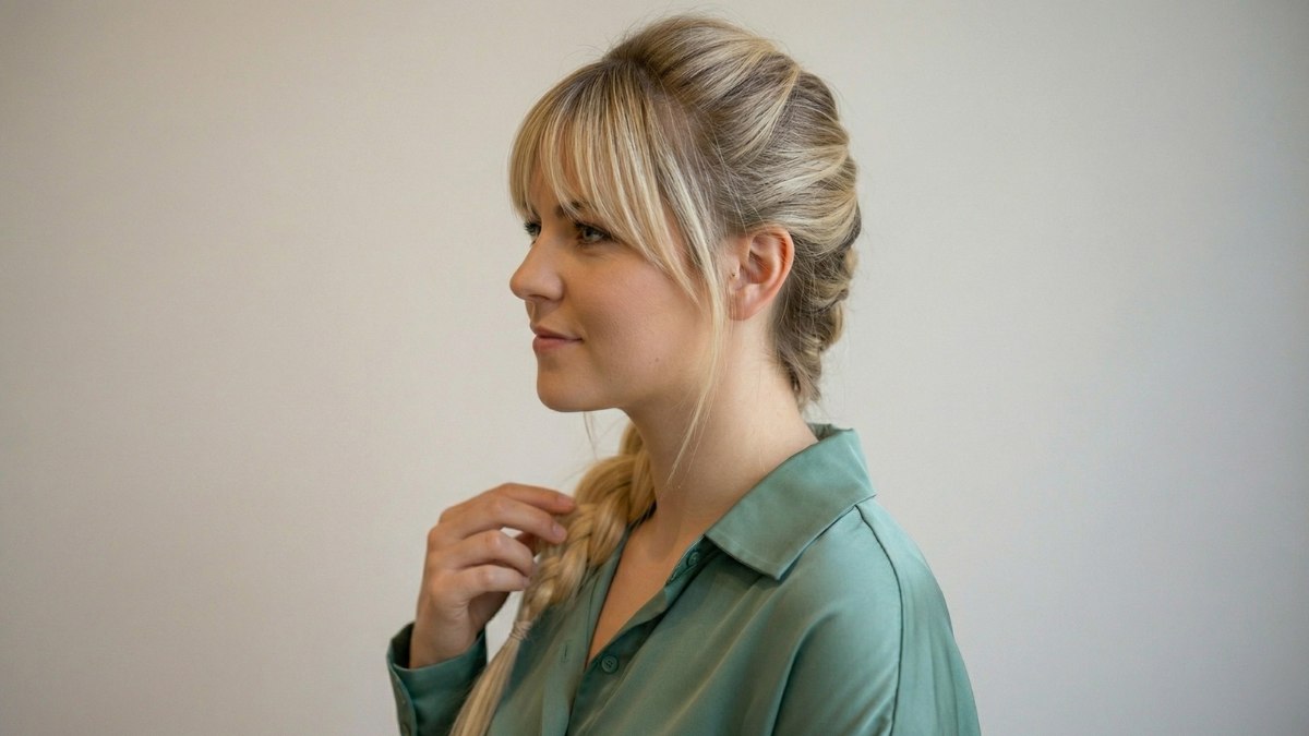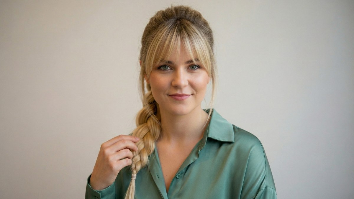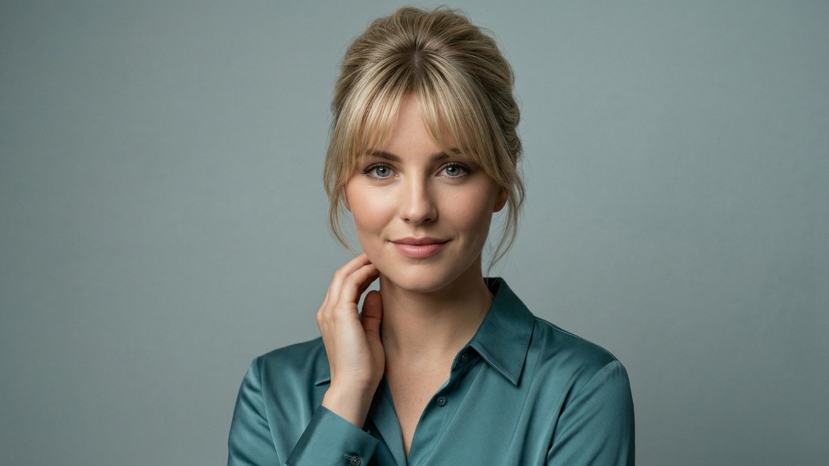De pony valt losjes over het voorhoofd, bijna als een lichte sluier. Dit geeft het gezicht een romantische en licht mysterieuze uitstraling. Het contrast tussen de stevige rol aan de achterkant en de zachte pony aan de voorkant zorgt voor een mooie balans tussen kracht en tederheid.
