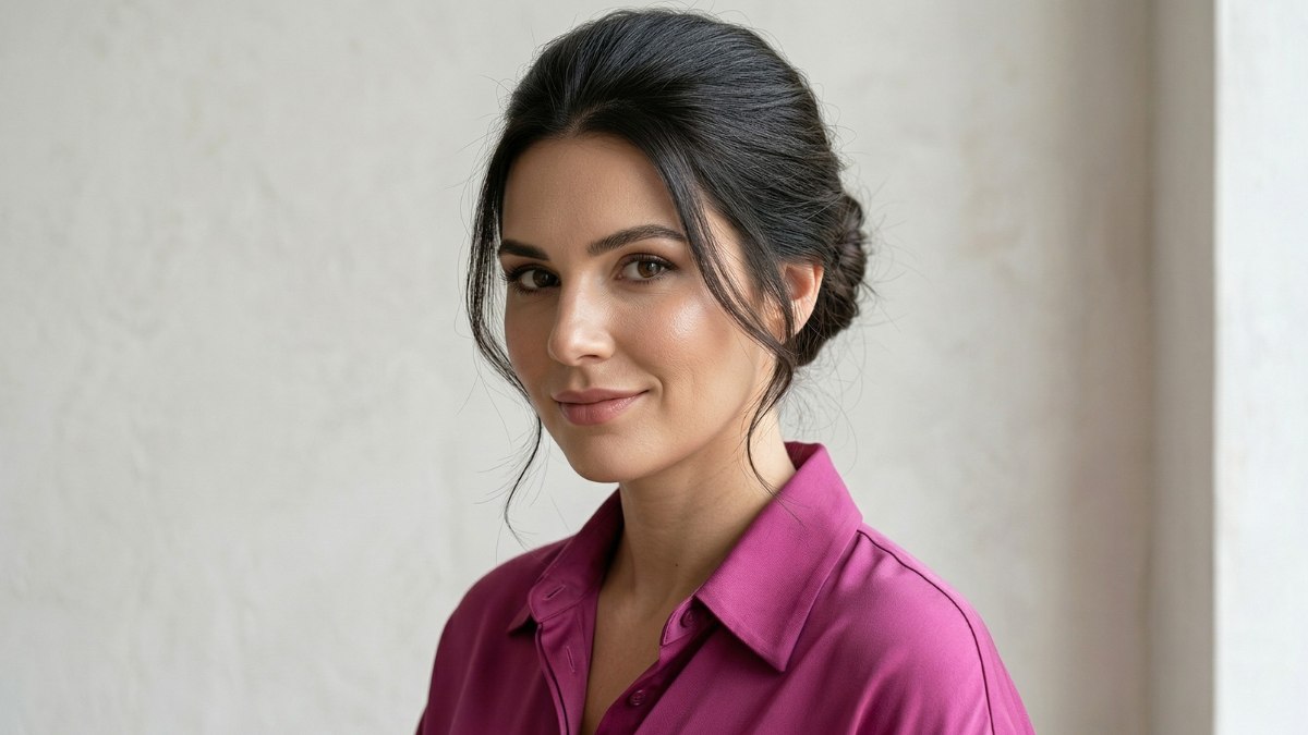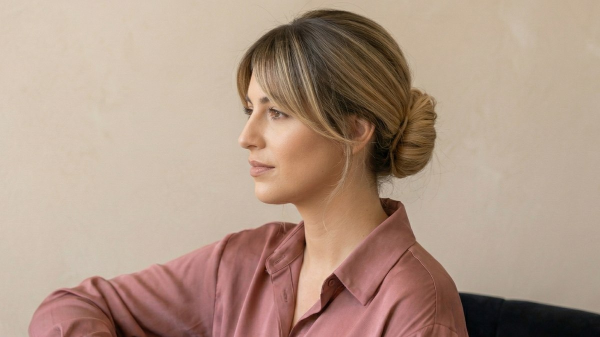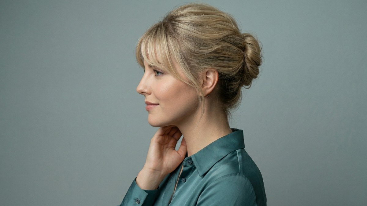De knot zelf is mooi rond en heeft net genoeg structuur om te voorkomen dat het er te ouderwets uitziet. Een paar fijne haarlokken vallen op een natuurlijke manier rond de oren en langs de nek. Dit zorgt voor een ontspannen toets, waardoor het kapsel toegankelijk en vriendelijk overkomt in plaats van gereserveerd of afstandelijk.