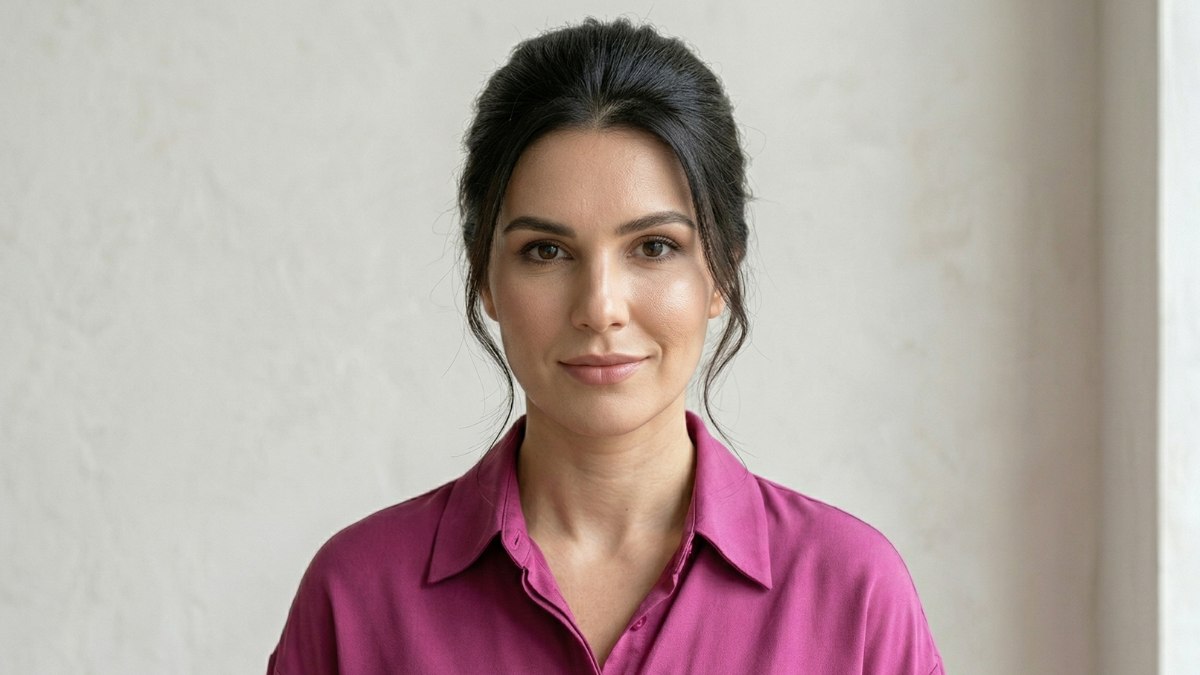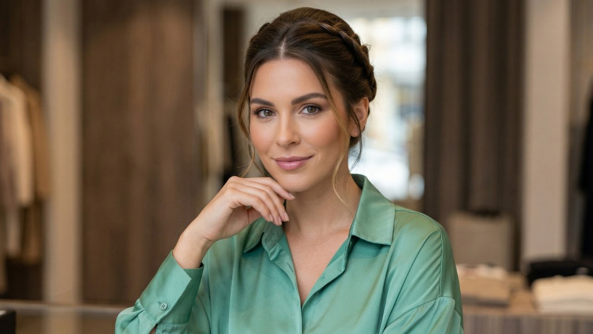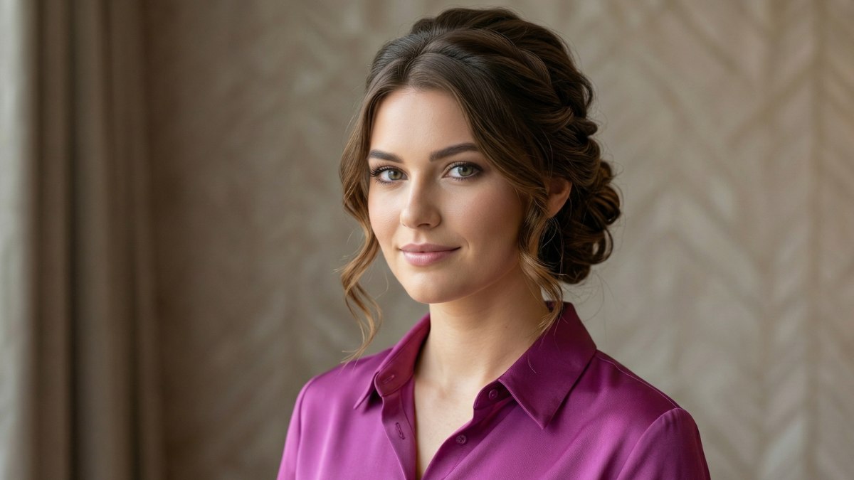 Aan de voorkant vallen een paar losse plukjes haar zachtjes langs het gezicht. Dit geeft het kapsel een ontspannen en natuurlijke uitstraling, waardoor het geheel nooit te stijf of te formeel wordt. Juist die kleine, speelse lokjes maken het verschil: ze zorgen ervoor dat de stijl moeiteloos en toegankelijk aanvoelt.
