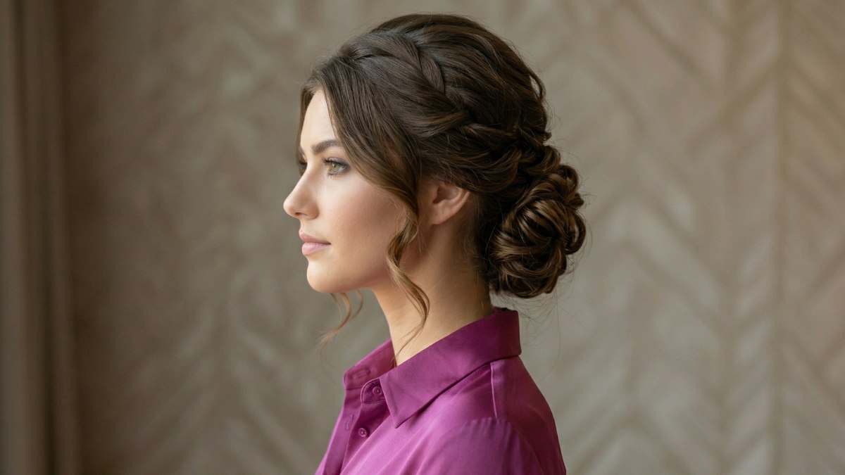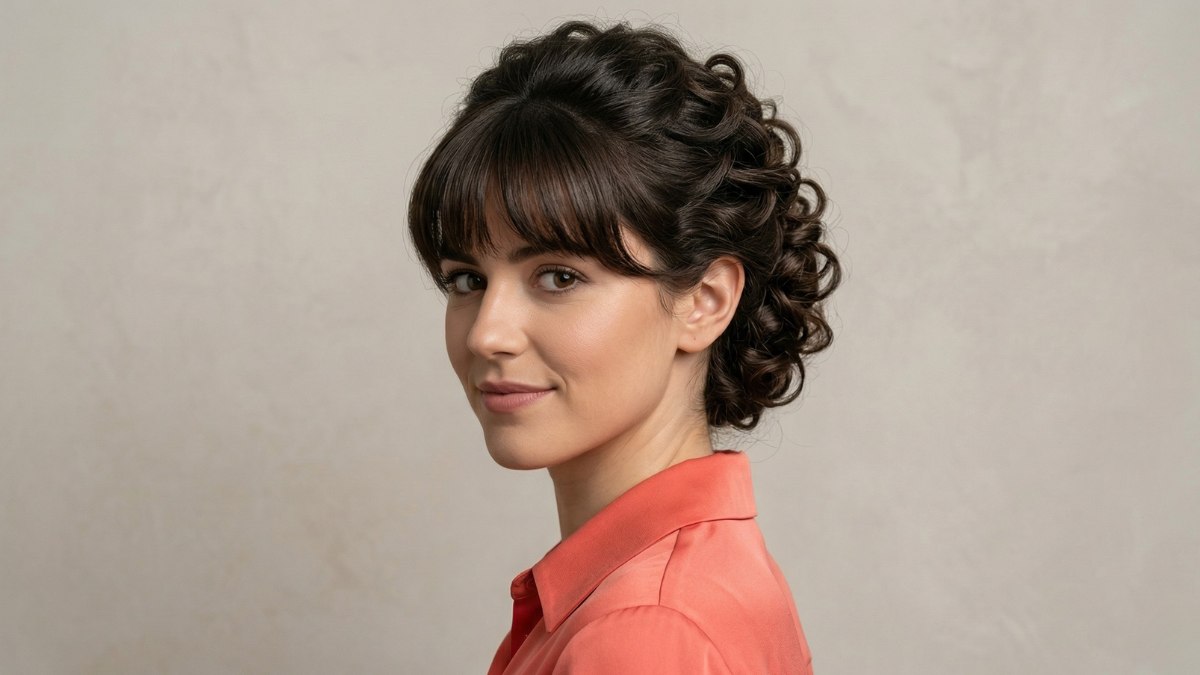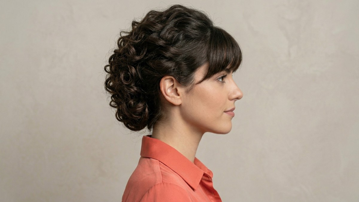 Van opzij zie je pas echt hoe bijzonder dit kapsel is. Je ontdekt dan hoe de krullen achter het oor en langs de achterkant van het hoofd vakkundig op elkaar zijn gestapeld. De diepe, donkerbruine kleur van het haar zorgt ervoor dat elke afzonderlijke krul goed tot zijn recht komt.
