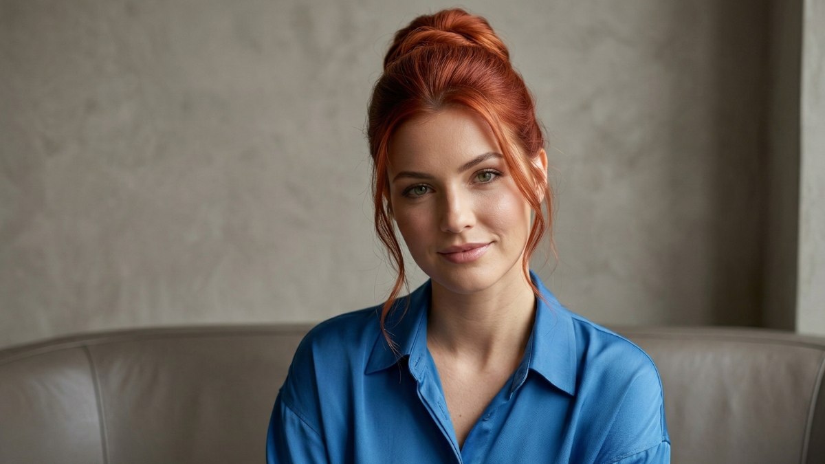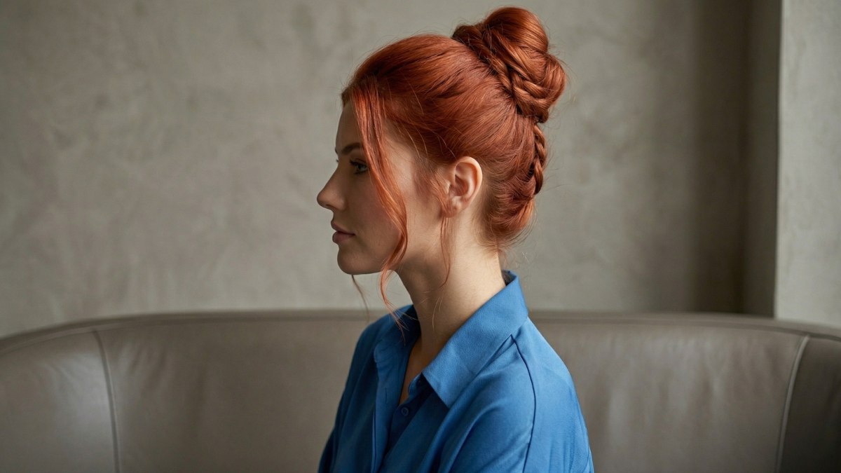 Om de knot heen is een vlecht gewikkeld in een strak en fraai patroon. Dit detail maakt de look werkelijk bijzonder en tilt het kapsel naar een hoger niveau. Het contrast tussen het gladde haar bovenop en de gevlochten structuur geeft een stijl die klassiek én modern tegelijk is. De warme rode kleur van het haar zorgt er bovendien voor dat de vlecht nog mooier naar voren springt.