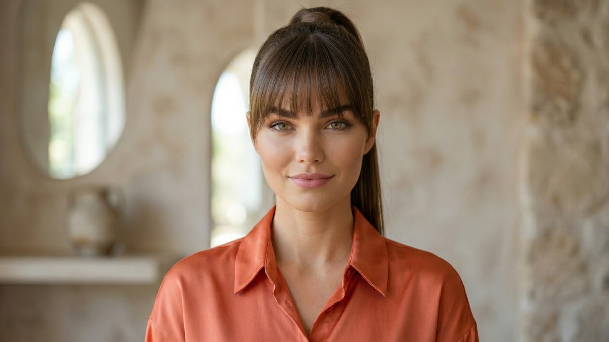 Een strakke rechte pony maakt de voorkant helemaal af. Het zorgt voor een scherpe lijn die de ogen extra benadrukt en het kapsel een moderne, modieuze touch geeft. De pony sluit naadloos aan bij de rest van de strakke stijl. Samen zorgen de hoge staart en de pony voor een gedurfde, zelfverzekerde uitstraling die zeker niet onopgemerkt blijft.