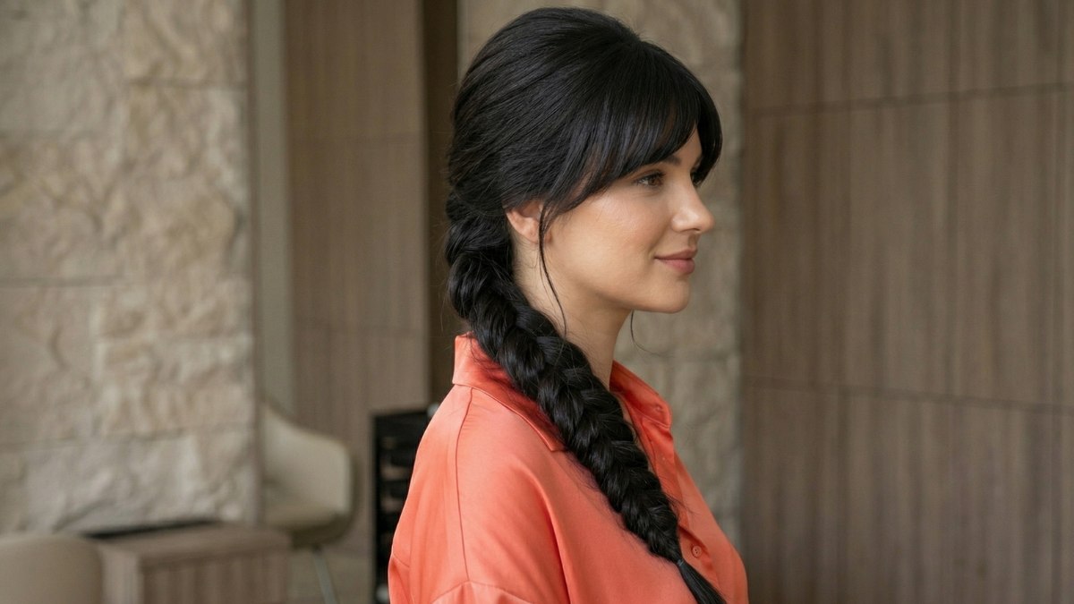 Bovenop begint het kapsel glad en netjes, en vanaf daar loopt de vlecht over één schouder naar beneden, tot zelfs voorbij het sleutelbeen. Alles is heel precies gevlochten, waarbij elk gedeelte strak tegen het volgende aansluit. Het ziet er bijna uit als een kunstwerk van haar.