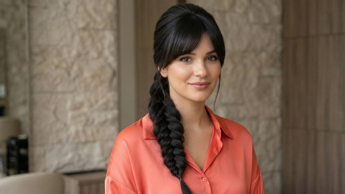 Aan de voorkant zijn een paar zachte plukjes losgelaten om het gezicht te omlijsten, en die kleine details zijn cruciaal voor de totale uitstraling. Zonder deze losse lokjes zou het kapsel misschien wat te streng kunnen overkomen. Nu zorgen ze voor een zachtheid die de vlecht perfect in balans brengt en de hele look warm en uitnodigend maakt.