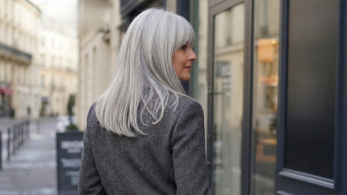 Dit is grijs haar op z'n vrijst en meest zelfverzekerd. Lang, gelaagd en afgewerkt met een volle pony die net onder de wenkbrauwen valt. Dit kapsel voelt tegelijk eigentijds en heel persoonlijk aan. Het hoort bij een vrouw die bewust heeft besloten haar haar voor zich te laten spreken.