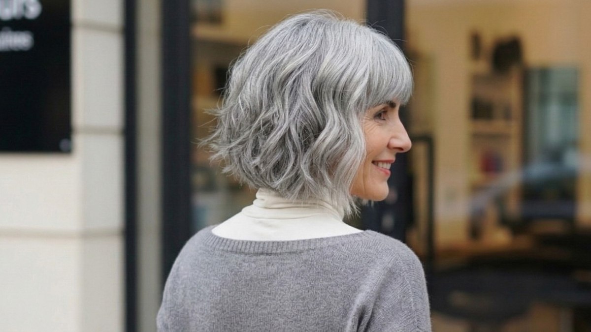 Dit is een bob die niet probeert te zijn wat hij niet is, en dat is precies wat hem zo mooi maakt. Een ode aan het natuurlijke karakter van grijs haar, en het levende bewijs dat textuur, beweging en een beetje golf helemaal niet getemd hoeven te worden.