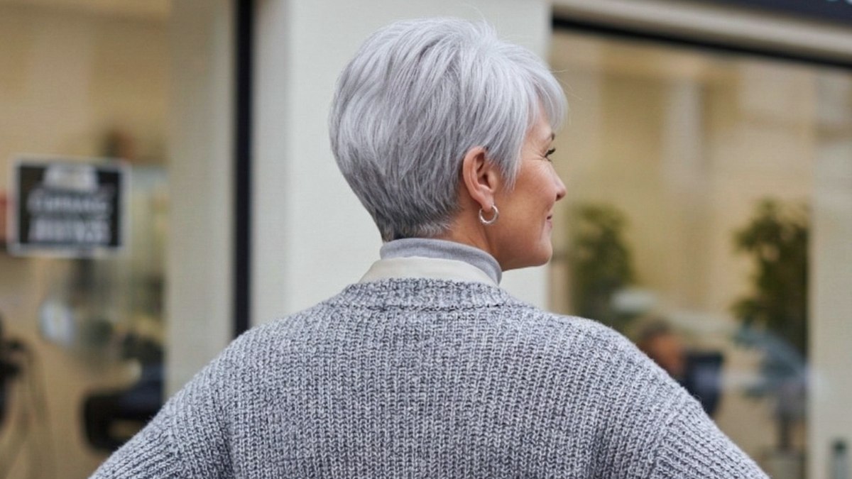 Een warmgrijze boothalstrui over een witte coltrui maakt het geheel af. Het warme grijs contrasteert prachtig met het koele zilver van het haar. Het is ontspannen van toon, maar duidelijk doordacht. Net als het kapsel.