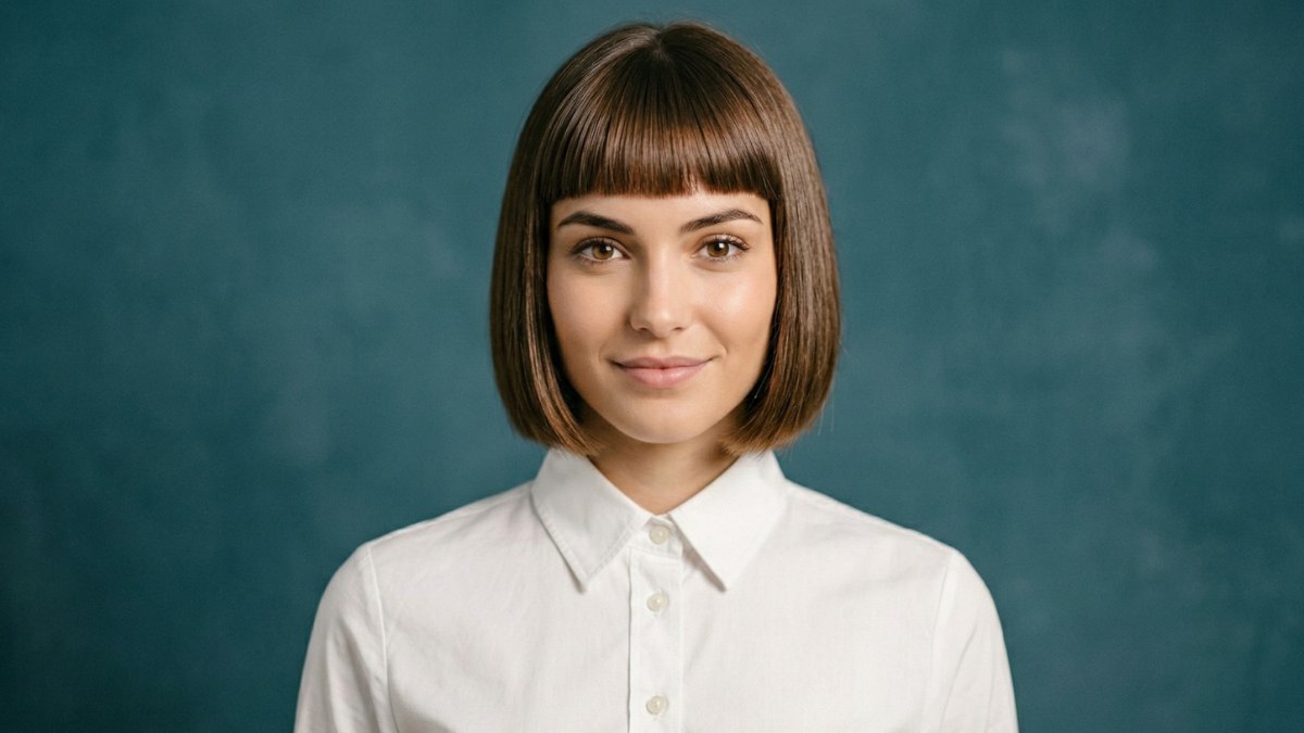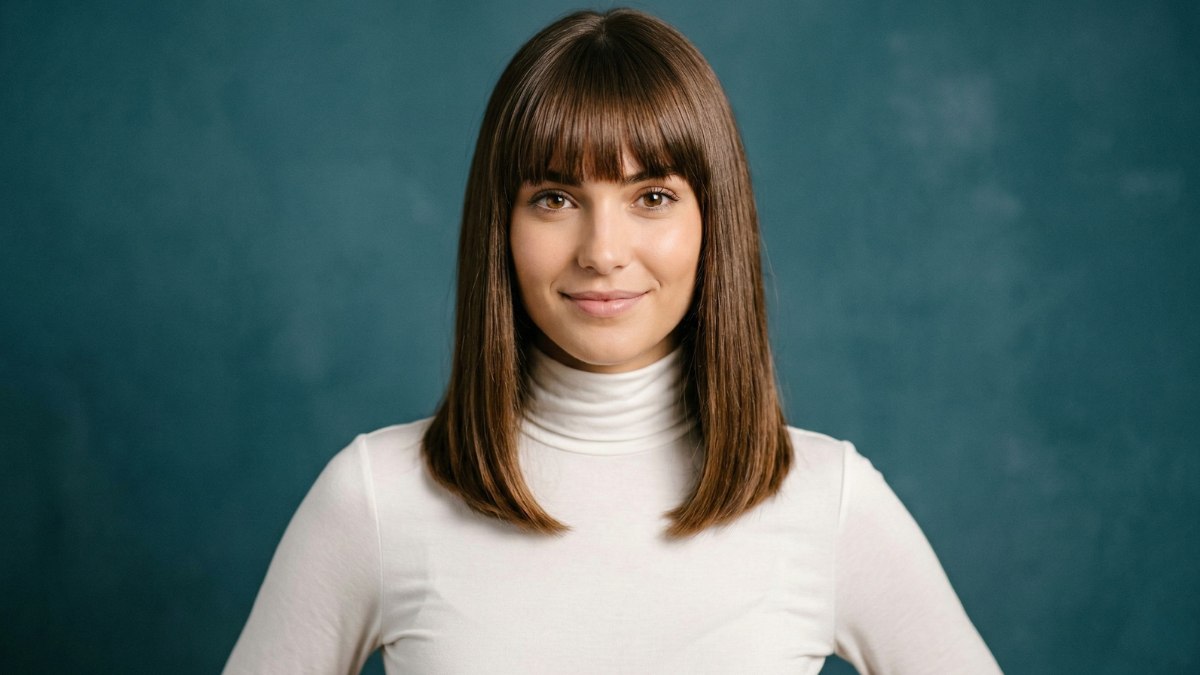 Dit is een klassieke look waar veel vrouwen hun hele leven lang tevreden mee zouden zijn. Haar lange, donkerbruine haar was mooi glad en viel net over haar schouders, waardoor haar gezicht op een zachte manier werd omlijst. De recht geknipte pony lag netjes over haar voorhoofd en gaf haar een verzorgde en nette uitstraling.