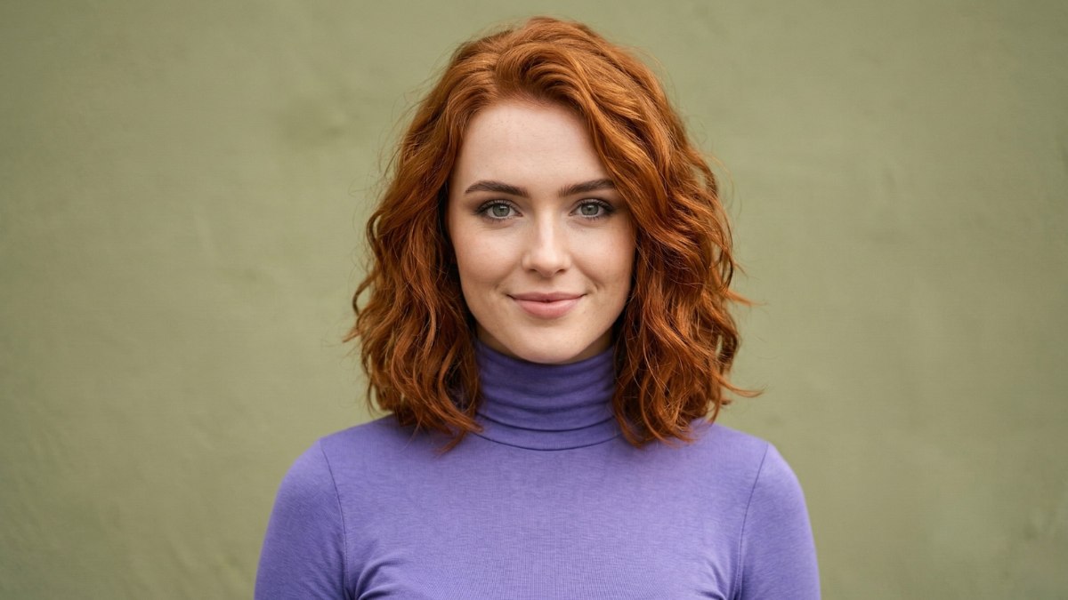 Ze had prachtige, volle rode krullen die tot op haar schouders vielen. De kleur was echt indrukwekkend: een diepe, gloeiende koperrode tint die het licht prachtig opving. Haar ogen kwamen heel mooi uit tegen die vurige warmte, en de hele look voelde energiek en vol passie.