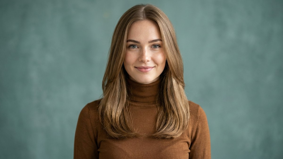 Ze had een lang kapsel dat zacht en elegant was. Haar warme bruine haar viel in subtiele lagen, waardoor het er heel glad en verzorgd uitzag. De kleur was een rijke, natuurlijke bruintint en het geheel oogde verfijnd.