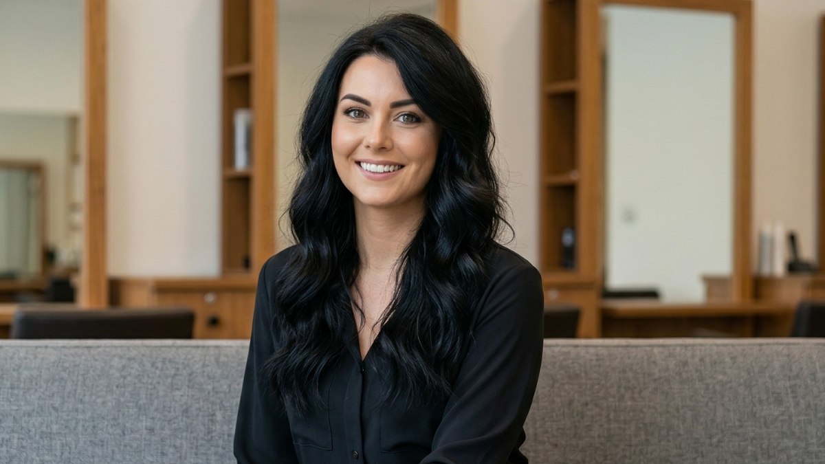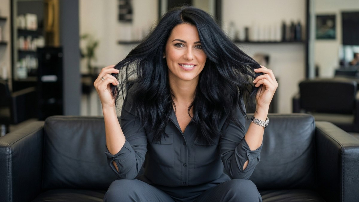 Er gaat een sereniteit en zelfverzekerdheid uit van haar dat zo donker en glanzend gestyled is. Dit lange kapsel is opgebouwd rond een diepe, blauwzwarte basiskleur die luxueus aanvoelt zonder ooit zwaar of dof te ogen. Een klassieke middenscheiding houdt de look in balans, terwijl lange lagen rond het gezicht de gelaatstrekken op een zachte manier omlijsten.
