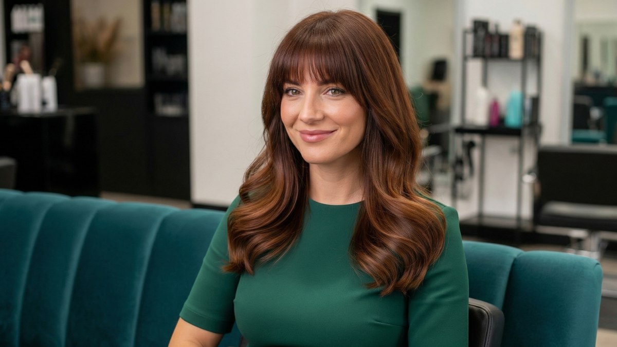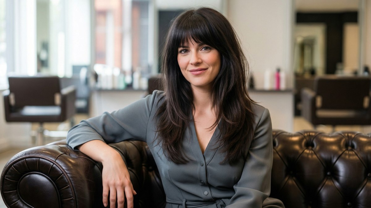 Dit is een prachtig gelaagd kapsel in een diepe, rijke bruintint dat de natuurlijke beweging van het haar accentueert in plaats van deze te onderdrukken. De zachte, gezichtsomlijstende pony valt sierlijk langs het voorhoofd en voegt een zweem van mysterie toe, terwijl de rest van het haar volumineus langs de schouders naar beneden golft.
