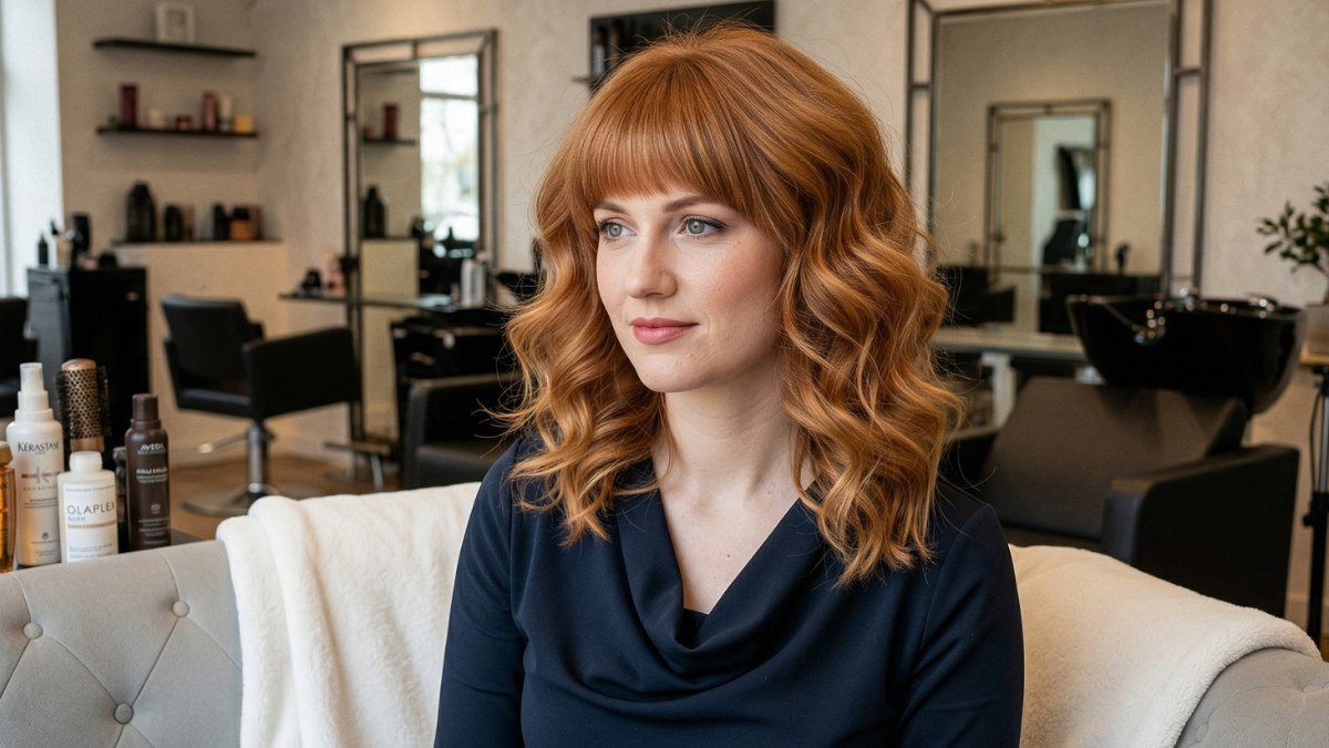 De pony is luchtig en subtiel verknipt, waardoor deze net boven de wenkbrauwen rust zonder zwaar te ogen. Het voegt een speelse, tikkeltje retro toets toe die prachtig harmonieert met de warmte van de koperkleur.