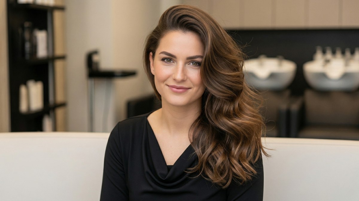 Deze look transformeert lang, kastanjebruin haar tot een volumineus meesterwerk vol beweging. Het is het soort kapsel dat absoluut niet zou misstaan op de rode loper, maar dat tegelijkertijd perfect draagbaar blijft in het dagelijks leven. Door het haar naar één kant te stylen, ontstaan er royale golven die bij elke beweging het licht op een andere manier vangen.