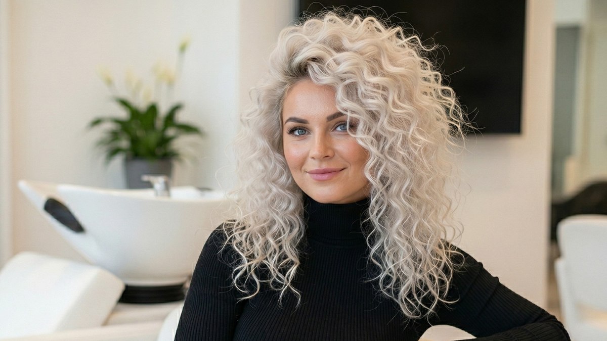 De platinatint is gedurfd, maar werkt hier zo goed omdat hij de textuur van de krullen accentueert. Het licht weerkaatst op elke spiraal, waardoor het haar bijna licht lijkt te geven. Dit kapsel vereist een flinke dosis zelfvertrouwen, en de vrouw die hiervoor kiest, is duidelijk niet bang om op te vallen in de menigte. In combinatie met een eenvoudige zwarte coltrui ontstaat er een contrast dat direct de aandacht trekt.