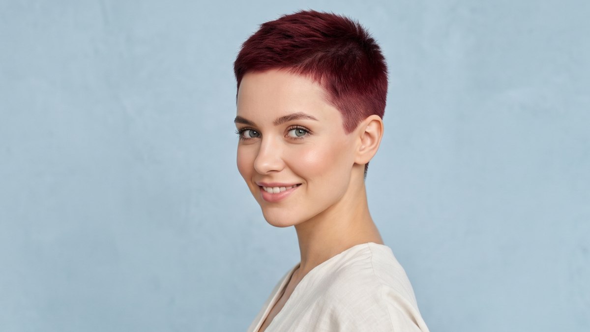 De bordeauxrode kleur is intens en staat prachtig bij een lichte huid en lichte ogen. Het kapsel zelf is een klassieke pixie: kort geknipt aan de zijkanten en achterkant, met iets meer lengte bovenop, waar het haar in zachte laagjes valt. Er zit een androgyne rand aan deze stijl die fris aanvoelt, maar hij is ook vrouwelijk doordat hij de aandacht naar het gezicht trekt.