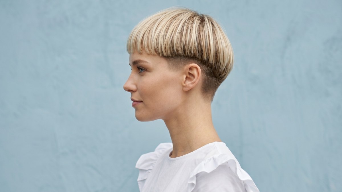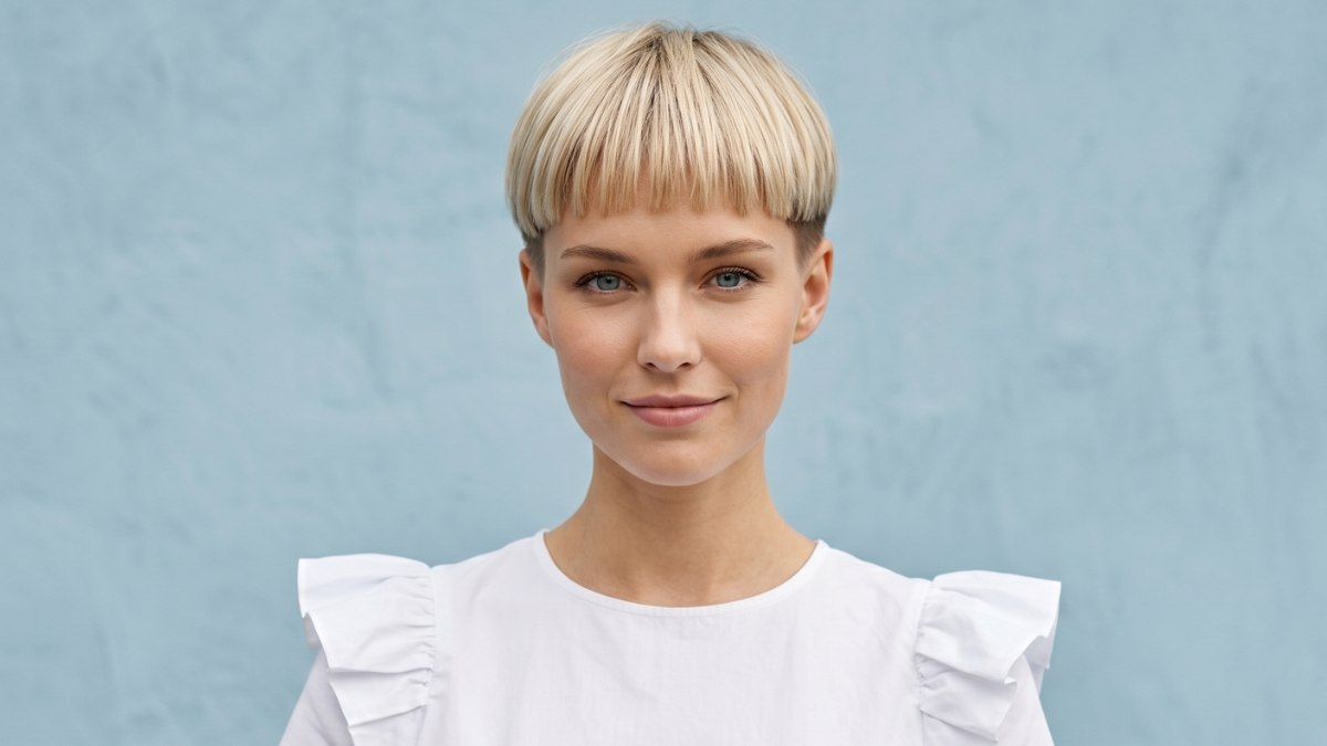 De komsnit is terug, en hij heeft er nog nooit zo chic uitgezien als nu. Deze blonde variant neemt wat ooit als een gedateerde stijl werd beschouwd en maakt er iets volledig eigentijds van. De snit is uiterst precies: een gladde "helm" van haar ligt bovenop het hoofd met een perfect egale pony over het voorhoofd, terwijl de zijkanten en achterkant heel kort zijn opgeschoren.
