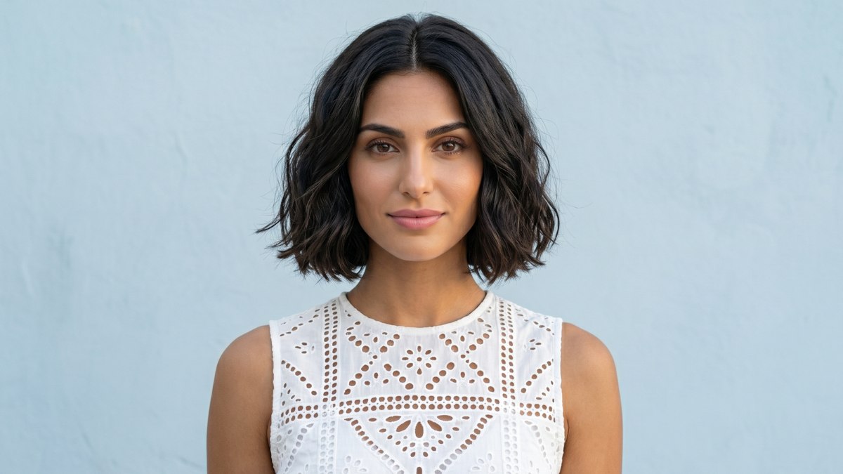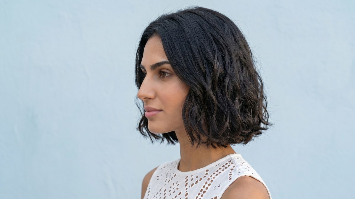 Het haar is geknipt in een zachte, ronde bob die ruim boven de schouders valt, met een middenscheiding en losse, natuurlijke golven die voor beweging zorgen. De kleur is een zeer diepe, bijna blauwzwarte bruine tint, rijk en glanzend, en vormt een mooi contrast met de warme huidskleur.