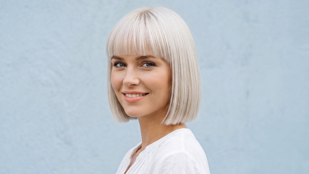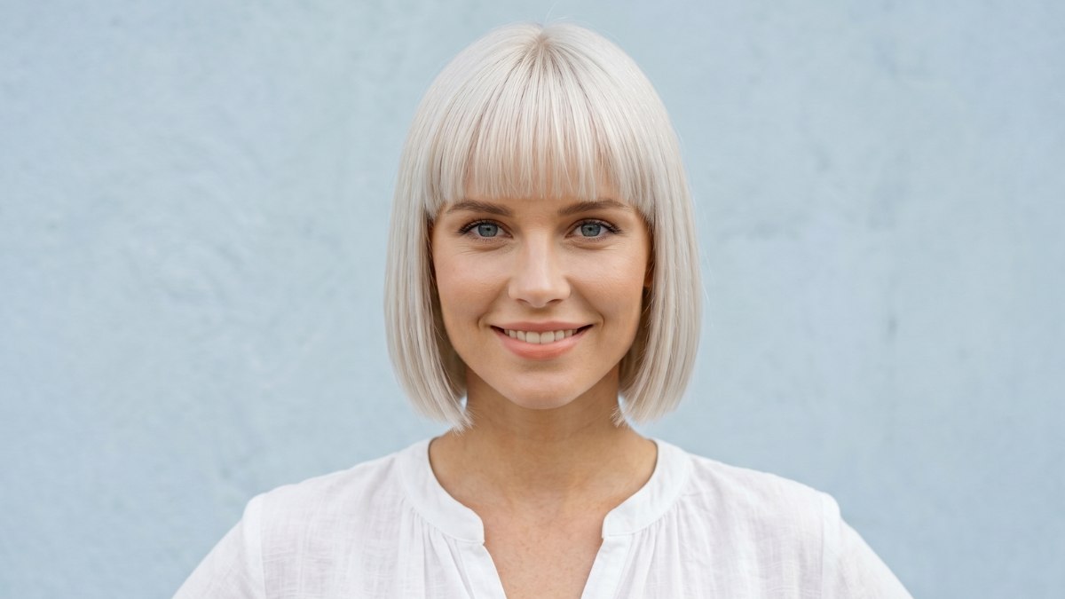 Deze platina bob met stompe pony is een kapsel dat vanuit elke hoek even indrukwekkend oogt. Het haar is geknipt in een scherpe, rechte bob die tot net onder de kin valt, met een volle pony die netjes over het voorhoofd ligt. De kleur is een koele platinablonde tint.
