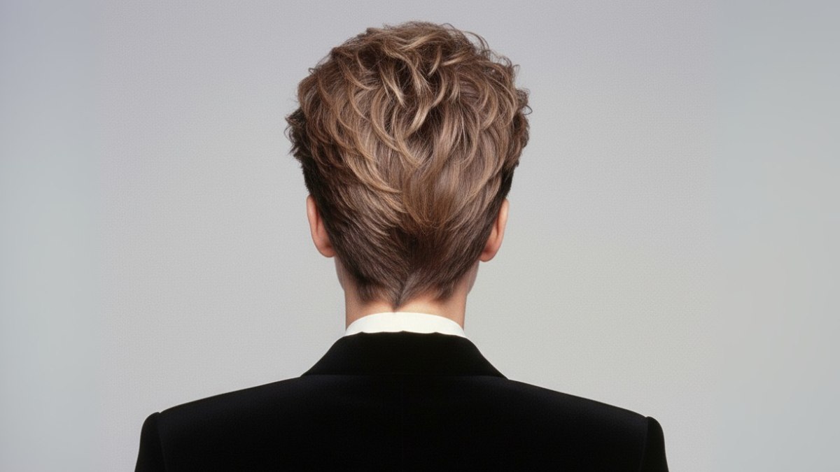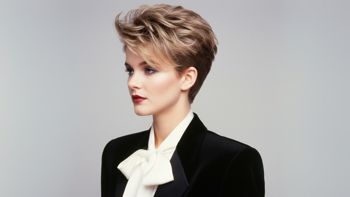 Deze getextureerde pixie is het toonbeeld van jaren-tachtig-haarvakmanschap, waarin precisieknipwerk en doelgerichte styling samenkomen voor maximaal effect. De korte coupe heeft strak getaperde zijkanten en een zeer korte nekpartij die een zuivere, elegante haarlijn vormt. De echte blikvanger bevindt zich bovenop: het haar is daar langer gelaten en sterk getextureerd om een speelse, beweeglijke structuur te creëren.