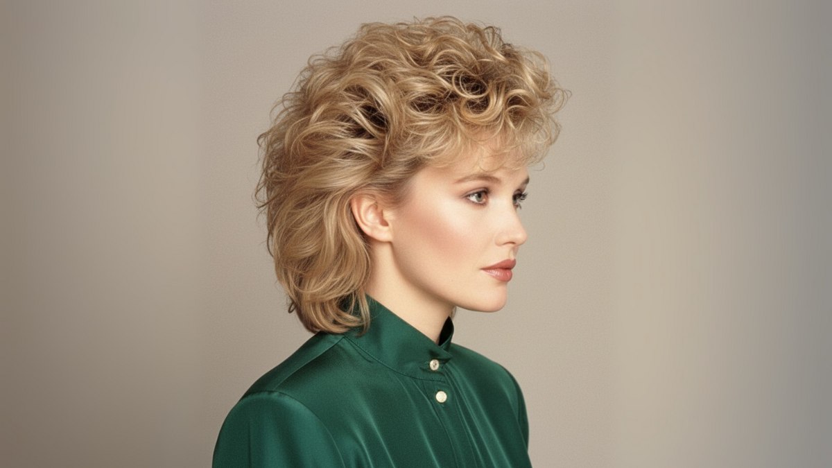 Deze volumineuze look vangt de essentie van de jaren tachtig-glamour met een explosie van zorgvuldig gevormde krullen en hoogte. Het haar is volledig gepermanent om textuur en body te creëren, en daarna zorgvuldig getoupeerd bij de kruin om die kenmerkende, luchtige lift te bereiken.