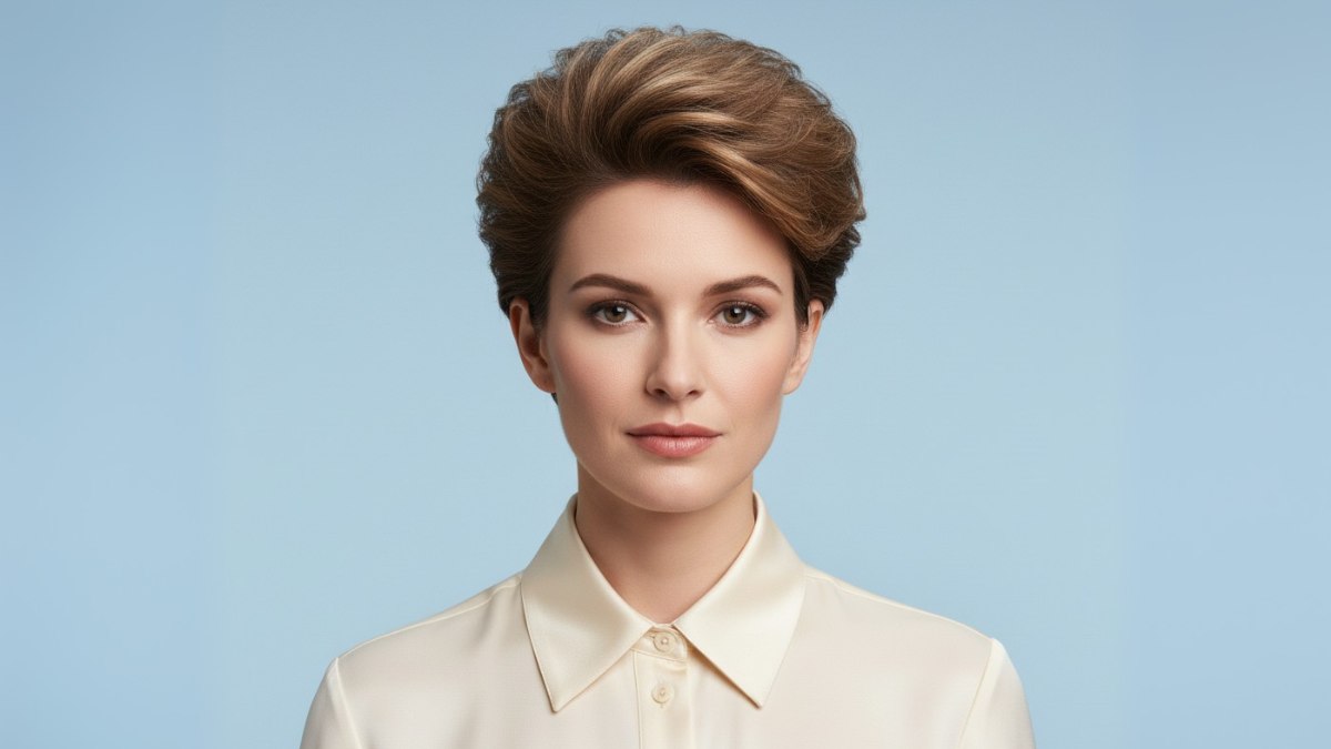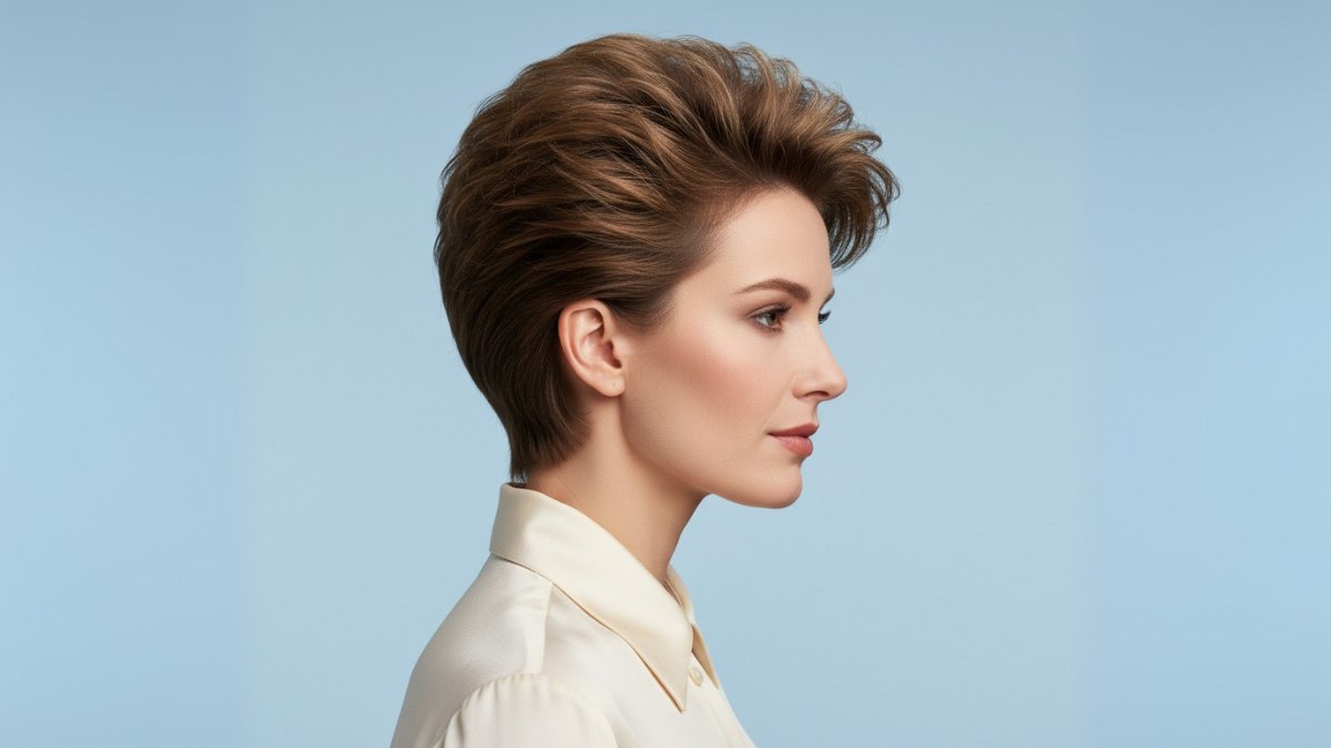 Wat dit kapsel onmiskenbaar jaren tachtig maakt, is de indrukwekkende lift op de kruin, bereikt door strategische laagjes en föhntechnieken. Het haar wordt naar achteren en omhoog gestyled, waardoor een vorm ontstaat die de zwaartekracht trotseert, maar toch elegant blijft.