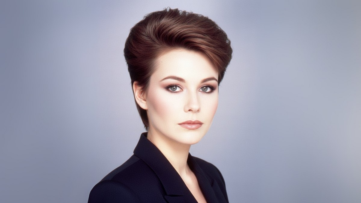 Deze verzorgde look vangt de essentie van de powerdressing-esthetiek die de stijl van professionele vrouwen in de jaren tachtig bepaalde. Het haar wordt vanaf het gezicht naar achteren en omhoog gestyled, waardoor er hoogte en volume ontstaat bij de kruin, terwijl de zijkanten glad en gecontroleerd blijven.