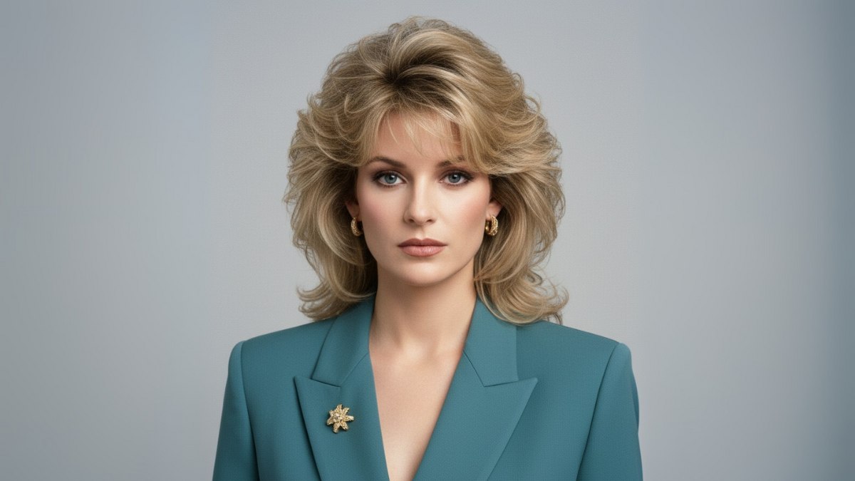 Deze lange haarstijl vertegenwoordigt de zachtere, meer romantische kant van de jaren tachtig-haarmode. Het haar valt soepel over de schouders met beweging en veerkracht, dankzij laagjes over de hele lengte. De pony is geknipt om het gezicht te omlijsten en schuin naar de zijkant gestyled, wat een flatterend gordijneffect creëert.